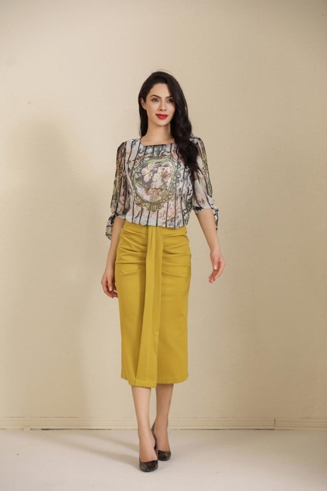 طقم تيور بلوزة شيفون مشجر تنورة كريب استرتش أخضر زيتي