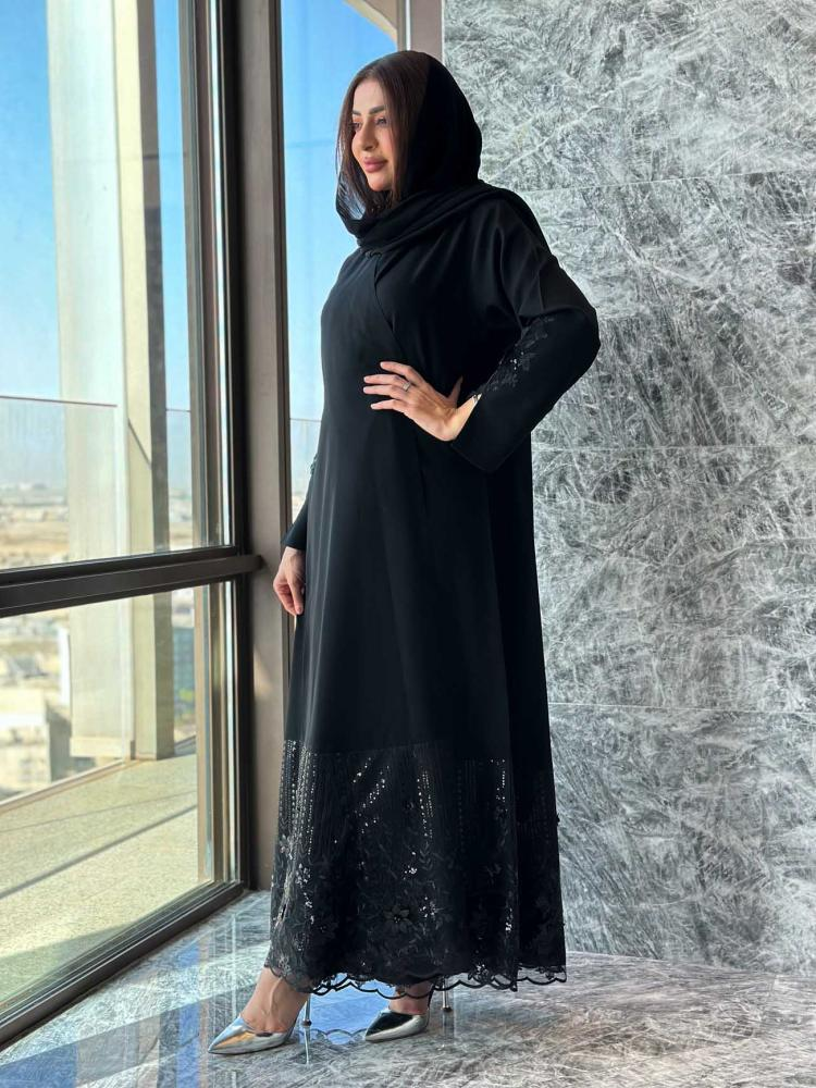 عباية لف فخمه كلوش مع تل مزين بشك خفيف القماش كتان مع طرحة