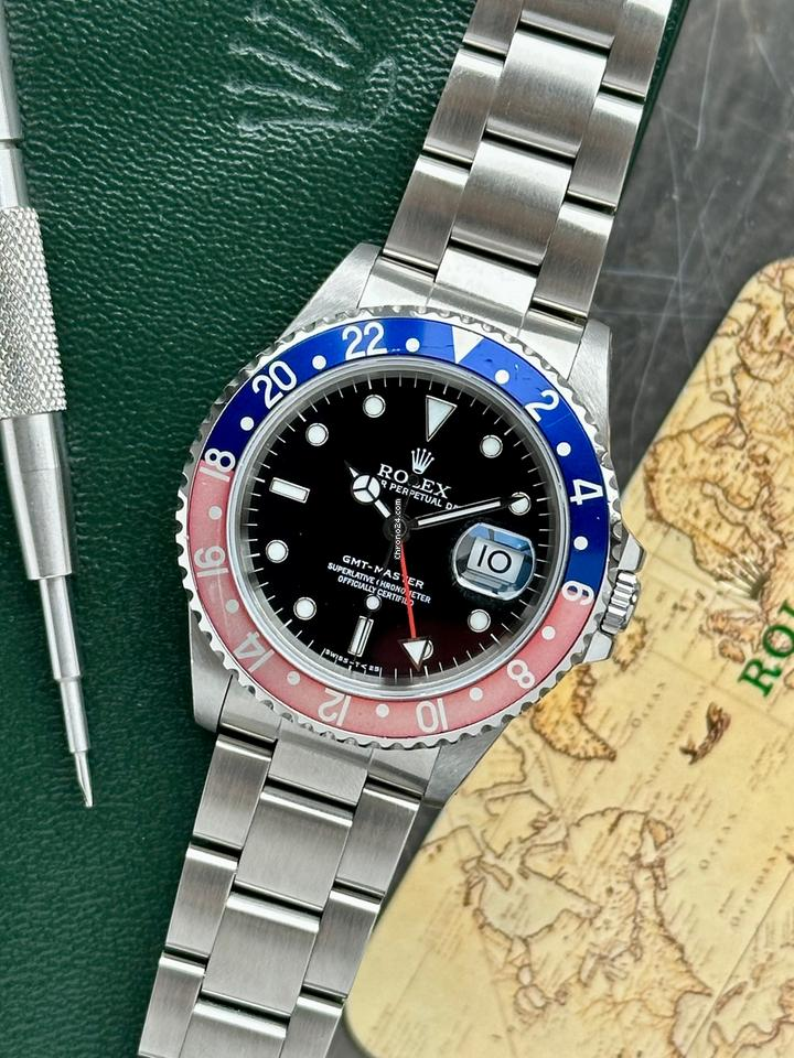 صُنعت ساعة رولكس جي إم تي ماستر هذه عام ١٩٩٧ (رقمها التسلسلي U). الساعة في حالة ممتازة، بعلبة أويستر سميكة أنيقة وعروات سميكة. كانت هذه الساعة المرجعية أول ساعة جي إم تي ماستر، وهي مزودة بميناء أسود لامع، وعلامات ساعات من الذهب الأبيض، وزجاج من الياقوت. يظهر على إطار بيبسي بعض البهتان. العلبة في حالة ممتازة. ثقوب قضيب الزنبرك نظيفة وواضحة وليست ممدودة. سوار أويستر الأصلي ٧٨٨٦٠ الصلب مع وصلات طرفية ٥٠١B لا يُظهر أي تمدد يُذكر. تعمل حركة عيار ٣١٧٥ بدقة عالية، وقد خضعت لصيانة كاملة من قِبل صانع ساعاتنا. يتم تسليم الساعة مع ورقة ضمان رولكس الأصلية وعلبتها. تسجيل الدخول أو سجللإرسال استفساراتك إلى البائع