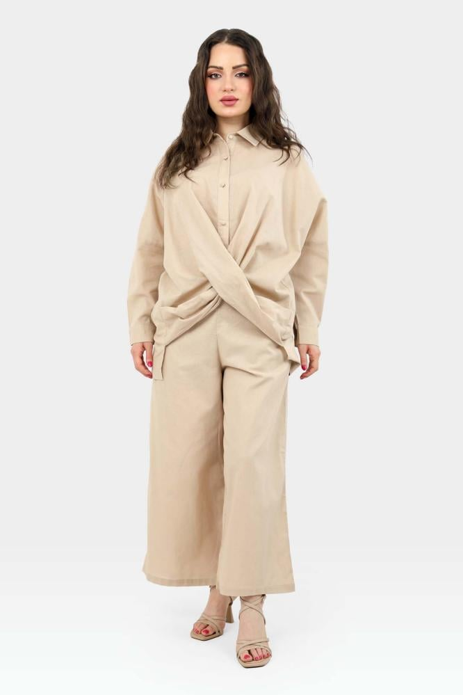 طقم قطعتين بنطلون وبلوزة لون بيج
